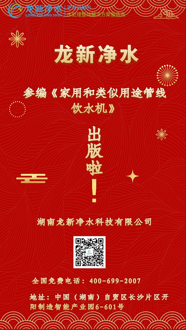 湖南龍新凈水科技術有限公司還參編了①《醫(yī)院水系統(tǒng)技術導則》,②《醫(yī)療機構污水處理系統(tǒng)建設標準》,③中國電子節(jié)能技術協(xié)會團體起草《綠色設計產品評價技術規(guī)范凈熱一體機》。