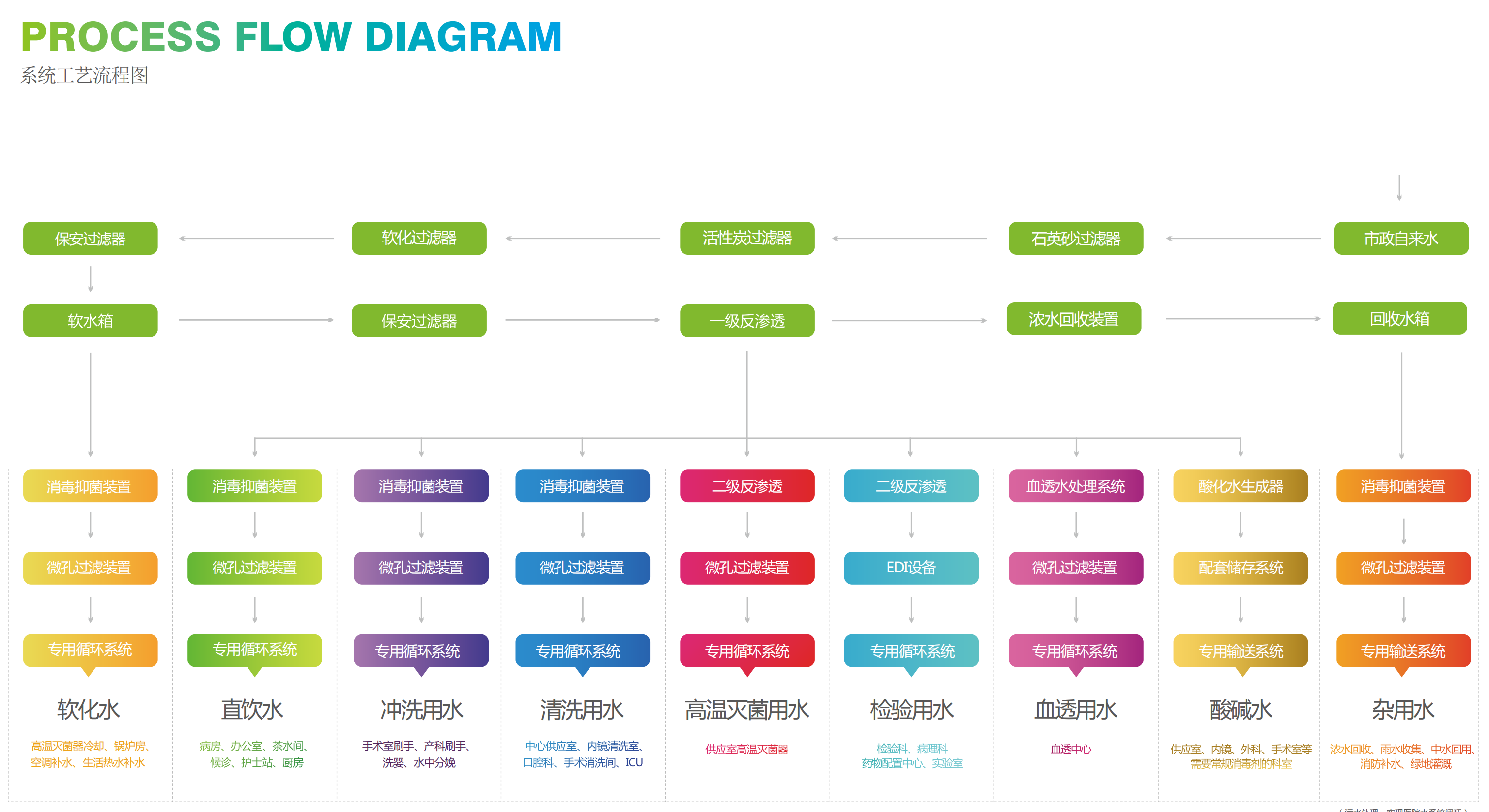 該項目龍新凈水根據(jù)醫(yī)院不同科室使用的水質(zhì)要求,先采用二級反滲透技術(shù),再采用后續(xù)處理如EDI和超濾技術(shù)等。把按科室需要的純水通過專用不銹鋼管網(wǎng)輸送到檢驗科、病理科、手術(shù)室、消毒供應(yīng)中心、血透室、內(nèi)鏡中心等。達(dá)到水資源綜合利用,節(jié)水節(jié)電,減少醫(yī)療設(shè)備用房,提高醫(yī)院信息化管理水平和效益。