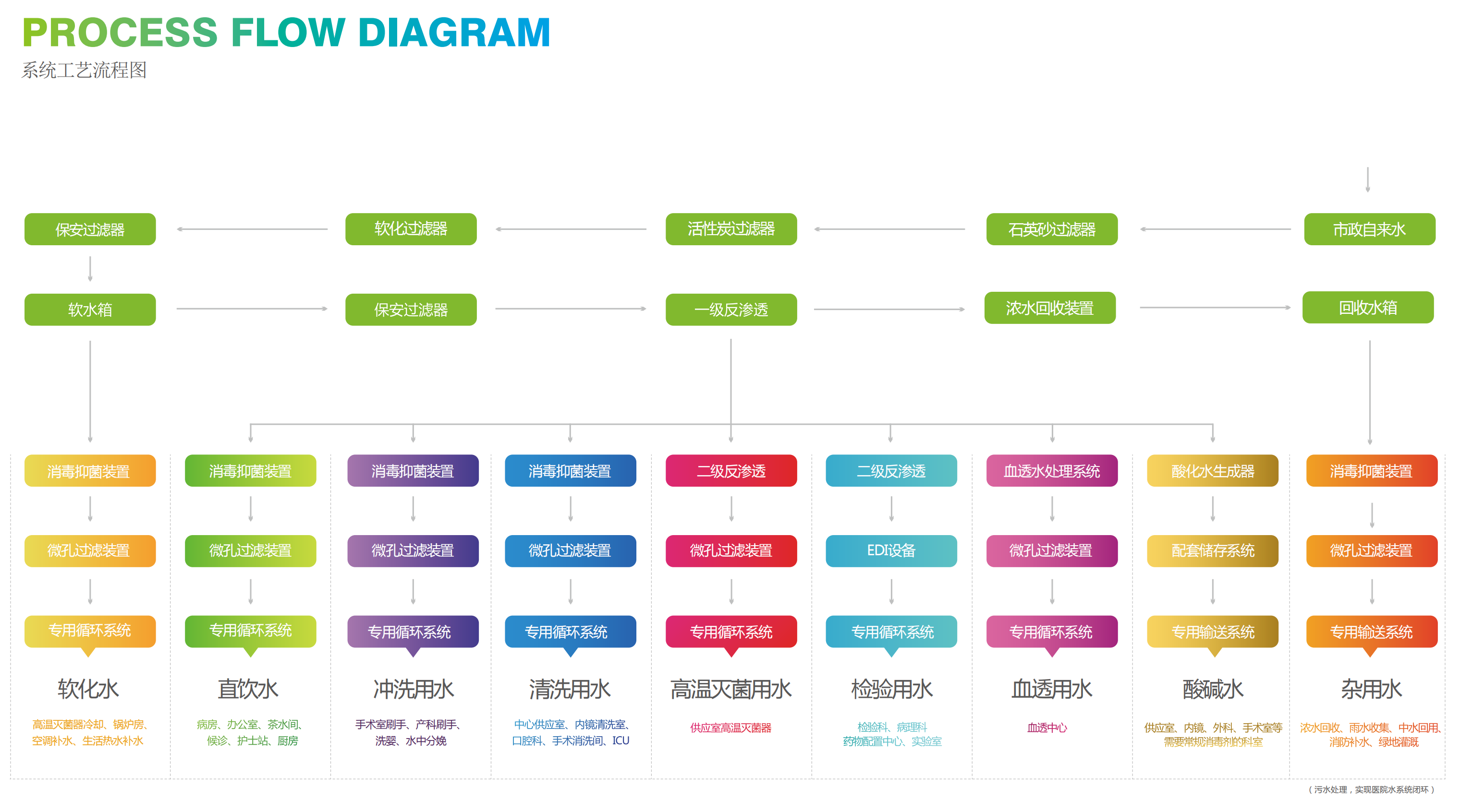 水資源是人類生存和社會發(fā)展必不可少的重要資源。隨著社會經(jīng)濟的迅速發(fā)展,水資源的重要性越來越凸顯,醫(yī)院作為服務型公共機構,水處理技術與水處理設備的選擇及使用是建設資源節(jié)約型、環(huán)保友好型醫(yī)院的主要途徑。醫(yī)院通過前期的水量設計與水質設計,明確院內各醫(yī)療單元水系統(tǒng)主要工藝設備及選型配置,為后期醫(yī)院智能化、綠色節(jié)能運維提供基礎。